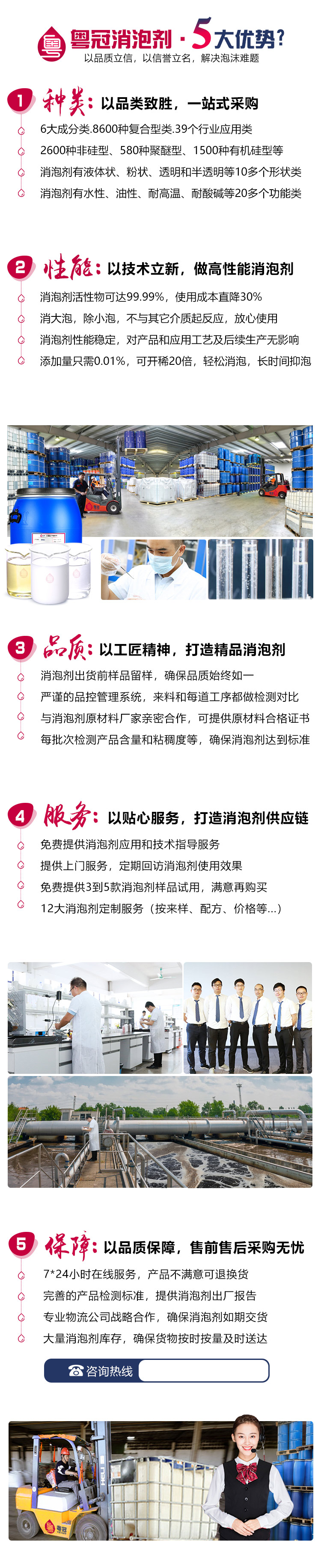粵冠消泡劑產(chǎn)品廣泛應(yīng)用于水處理、切削液、工業(yè)清洗、印染、造紙、涂料、粘合劑,生物發(fā)酵、電廠脫硫、石油開采等38個(gè)行業(yè)領(lǐng)域,有消泡解決方案3000多種類型。產(chǎn)品有有機(jī)硅類,聚醚類,礦物油類,高碳醇類,脂肪酸類,有單體,有復(fù)合體,有透明的,有淡黃的,有乳白的各種類型消泡劑,實(shí)現(xiàn)一站式采購。